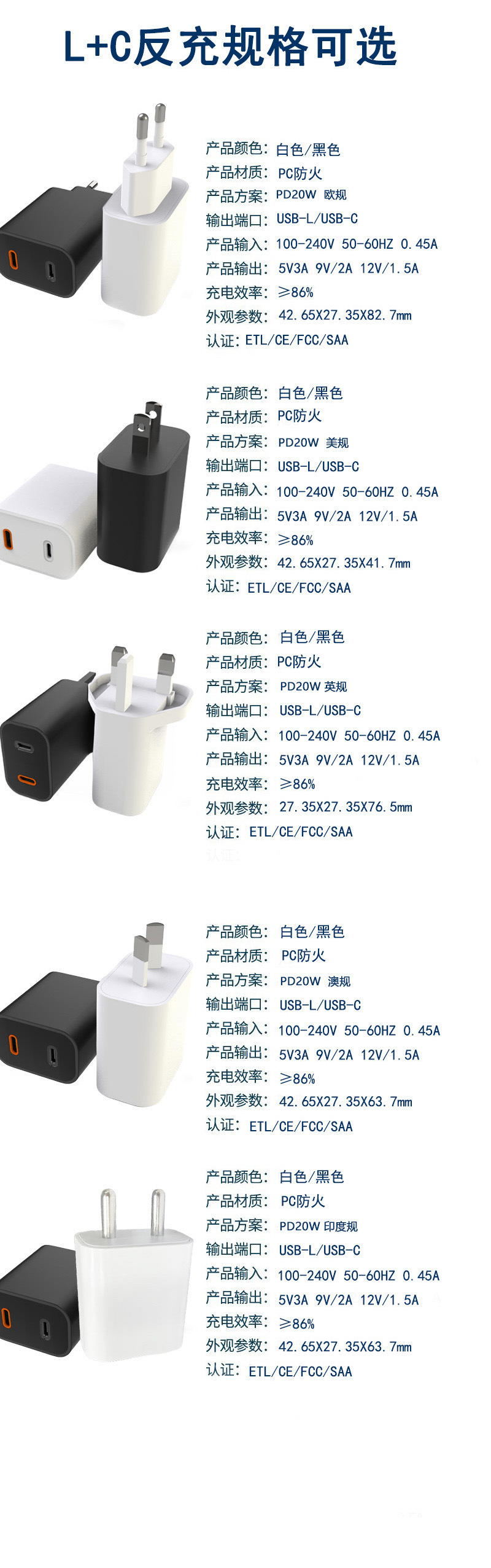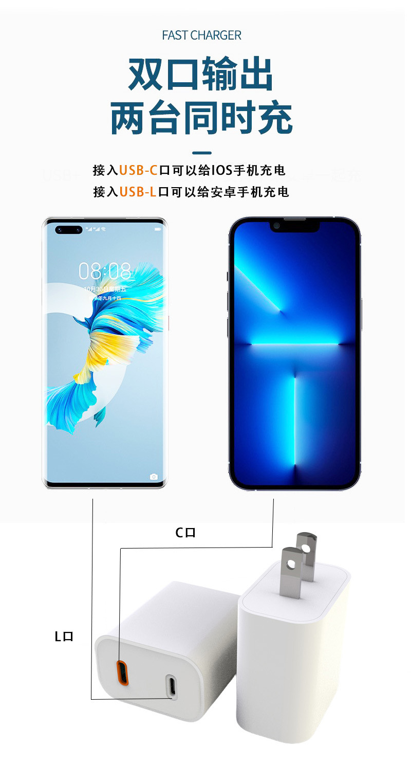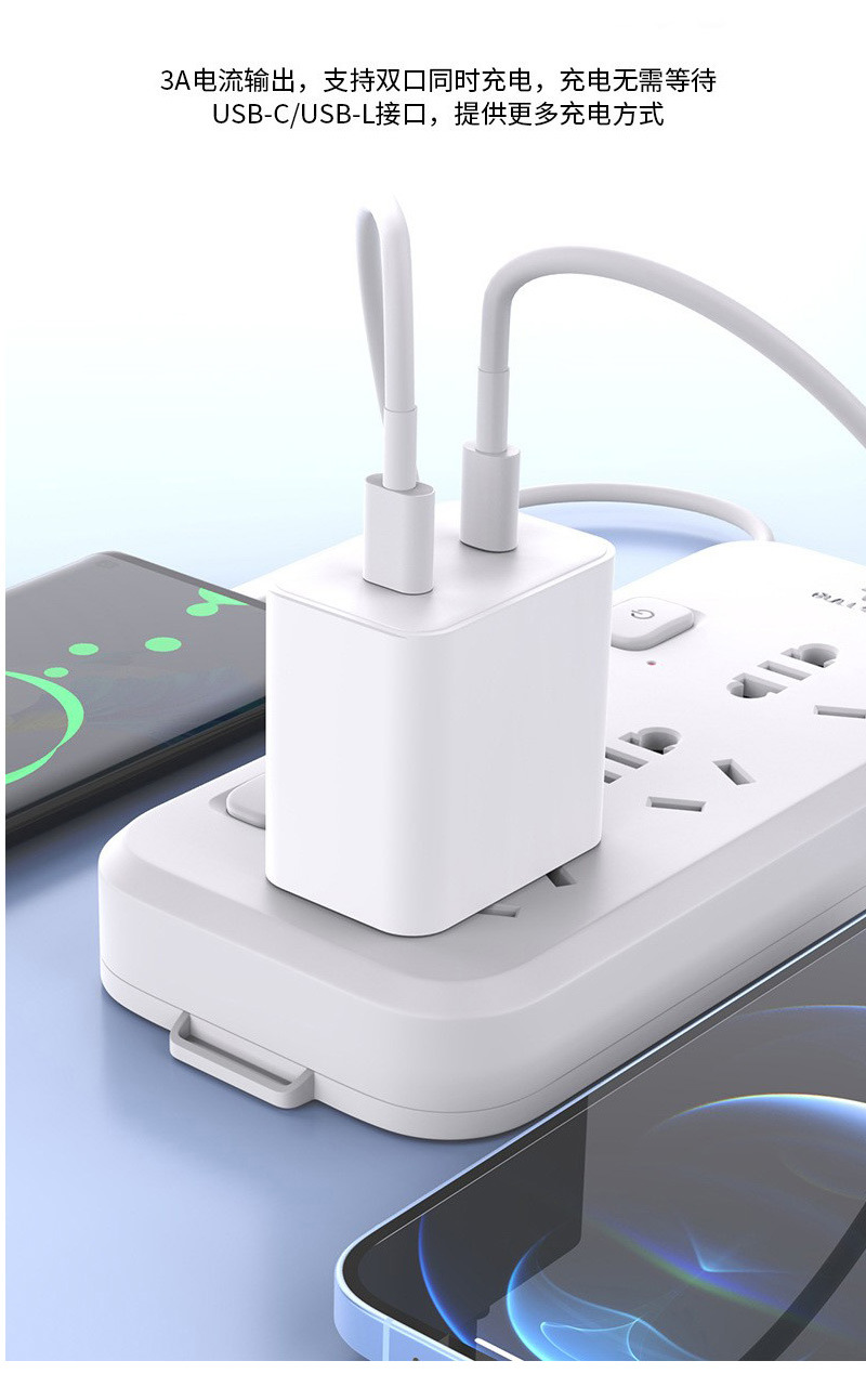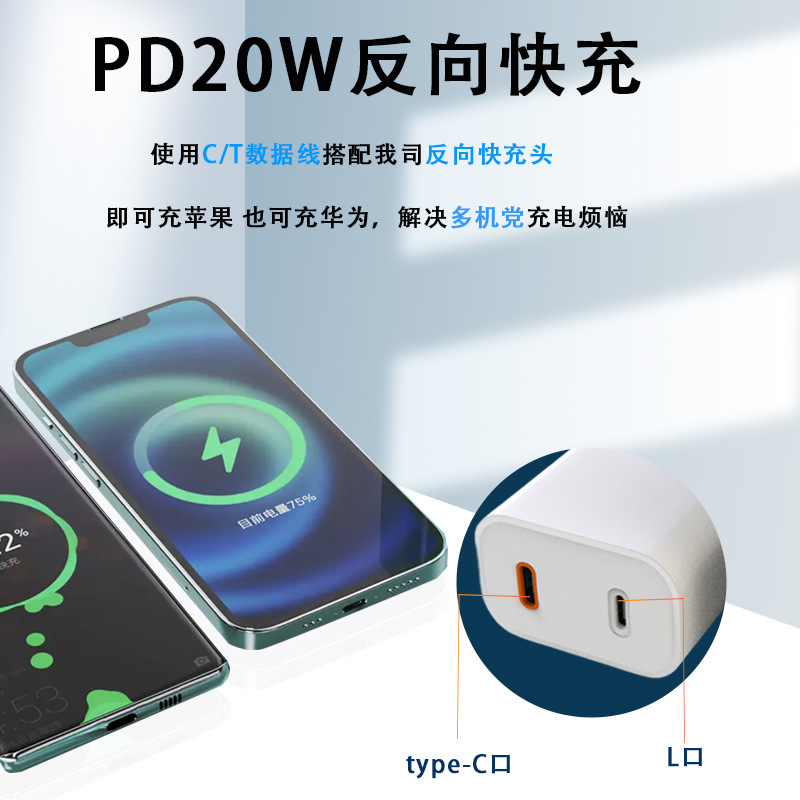 適用于華為,三星,蘋果快充 Ty配-C + Lighting 接口互換互轉(zhuǎn)互充 快充充電器。